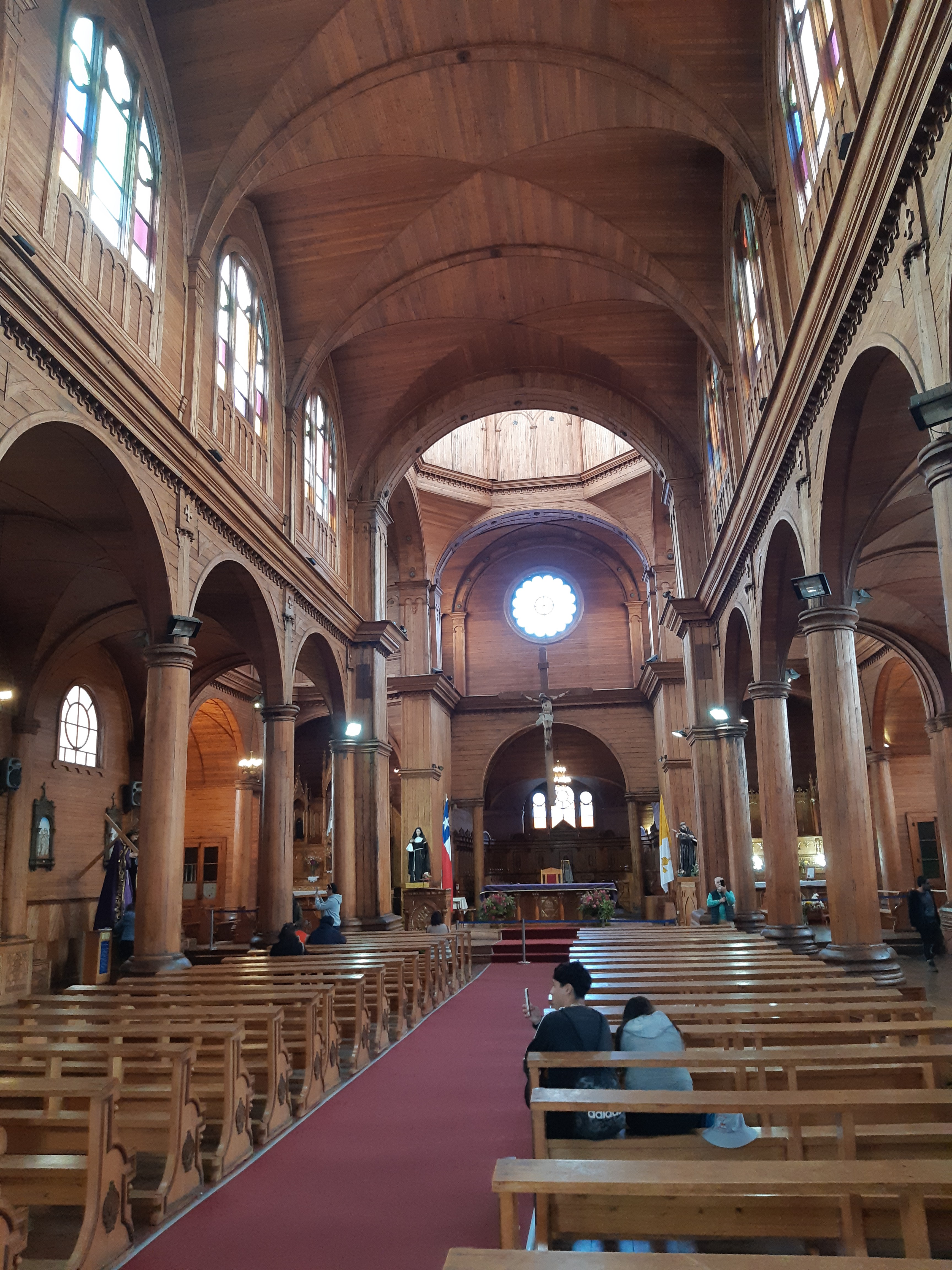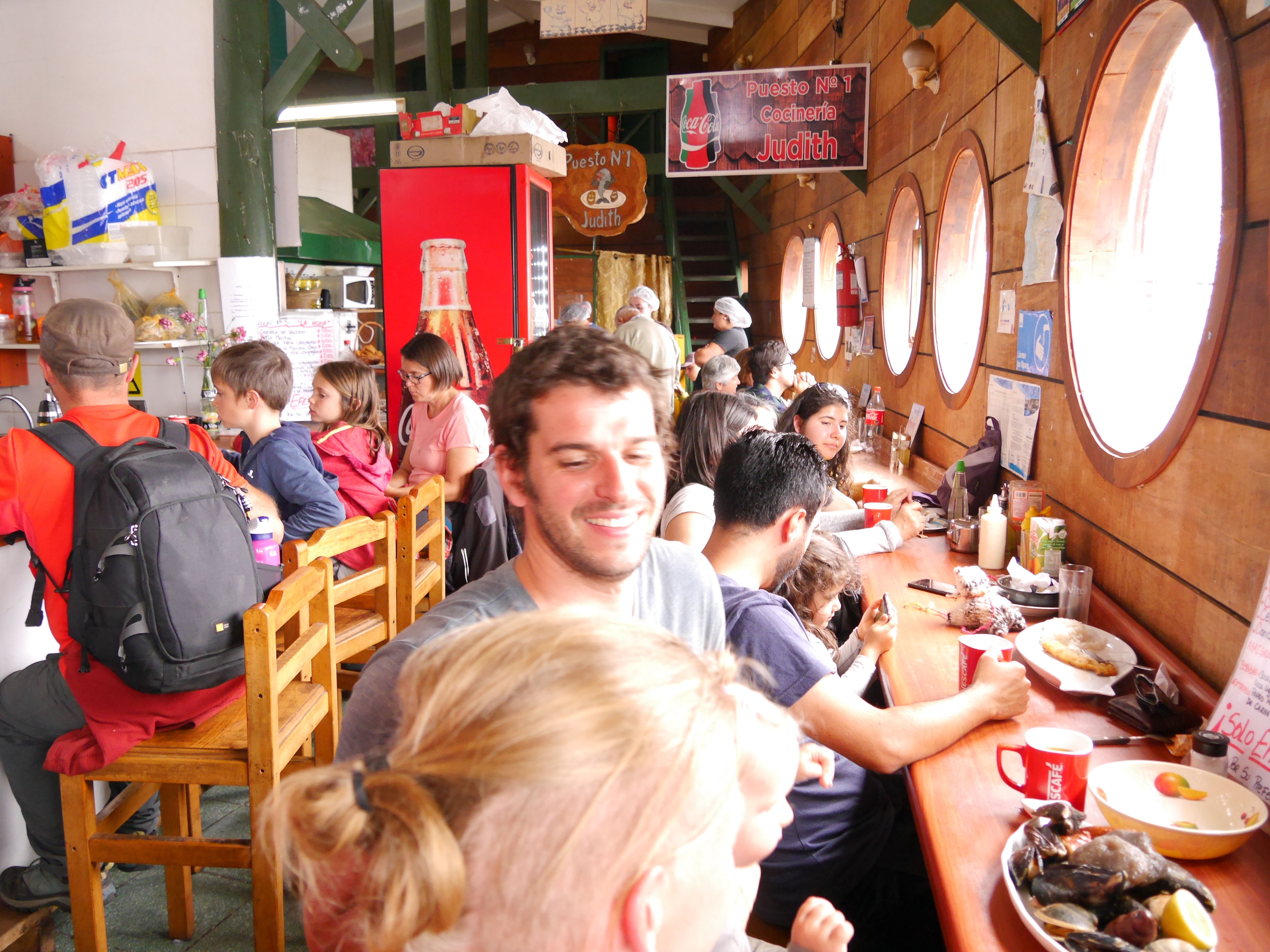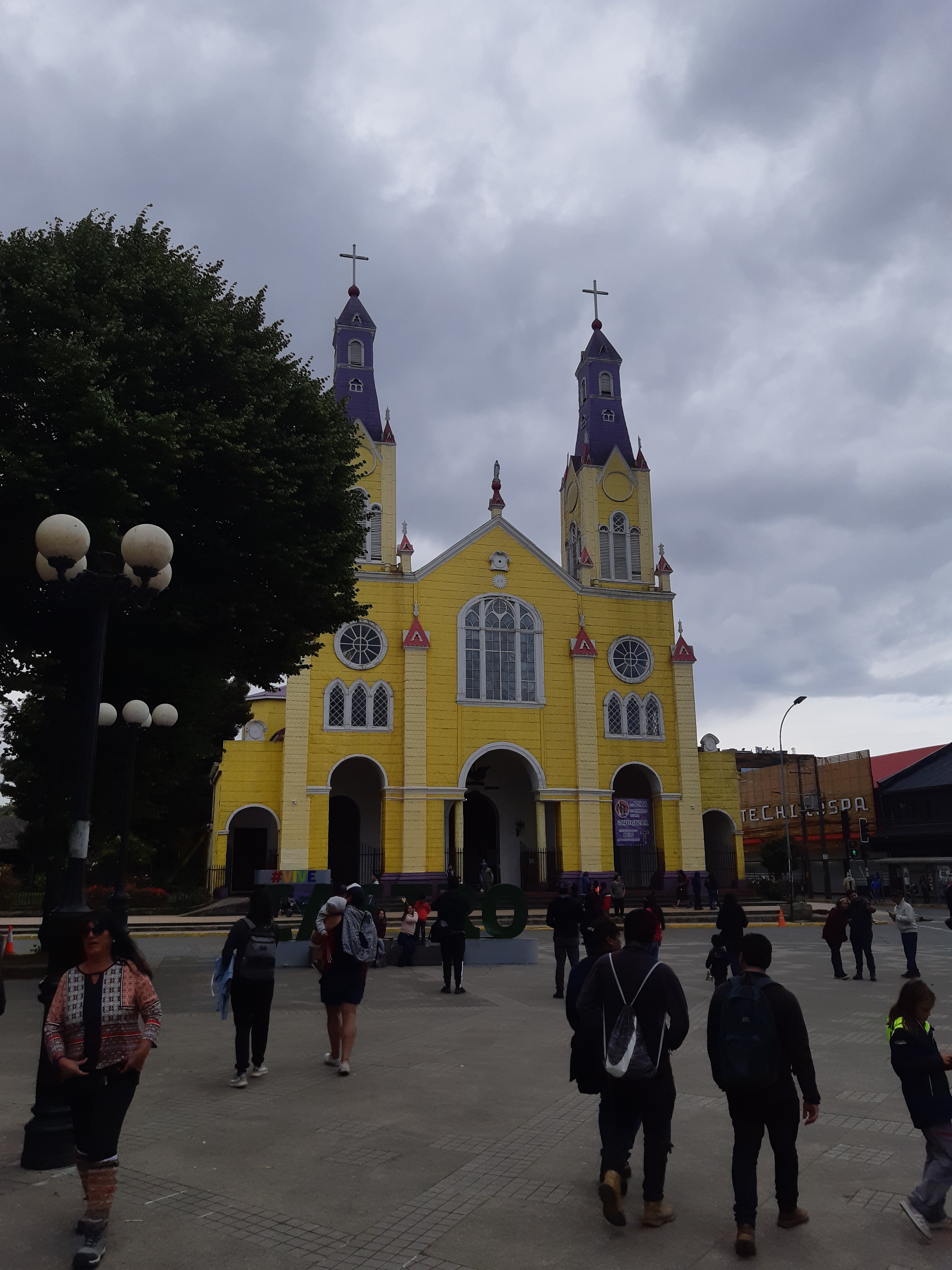 Nous voici donc à Castro, jolie et pentue ville moyenne, très colorée, dont la partie basse est bordée de palafitos, maisons de pêcheurs sur pilotis, le long de l’estuaire. Nos hôtes nous emmènent d’emblée y faire un tour. Barbie, qui bosse comme guide touristique pour arrondir les fins de mois, nous fait visiter l’église et la grand place, avec tous les détails qui rendent les choses 1000 fois plus intéressantes mais dont on ne profite que trop rarement parce qu’il vaut quand même mieux se payer une glace qu’un guide !