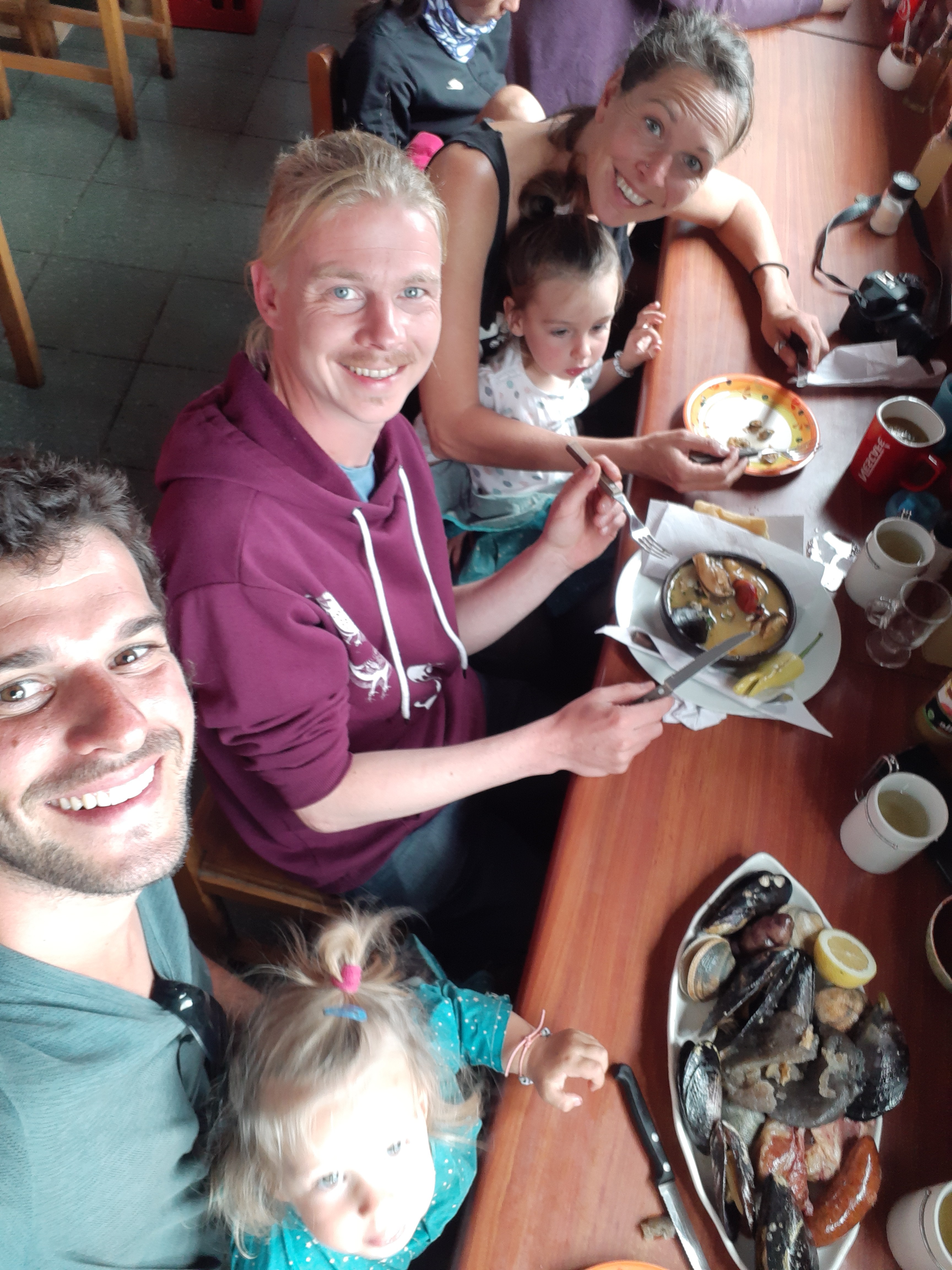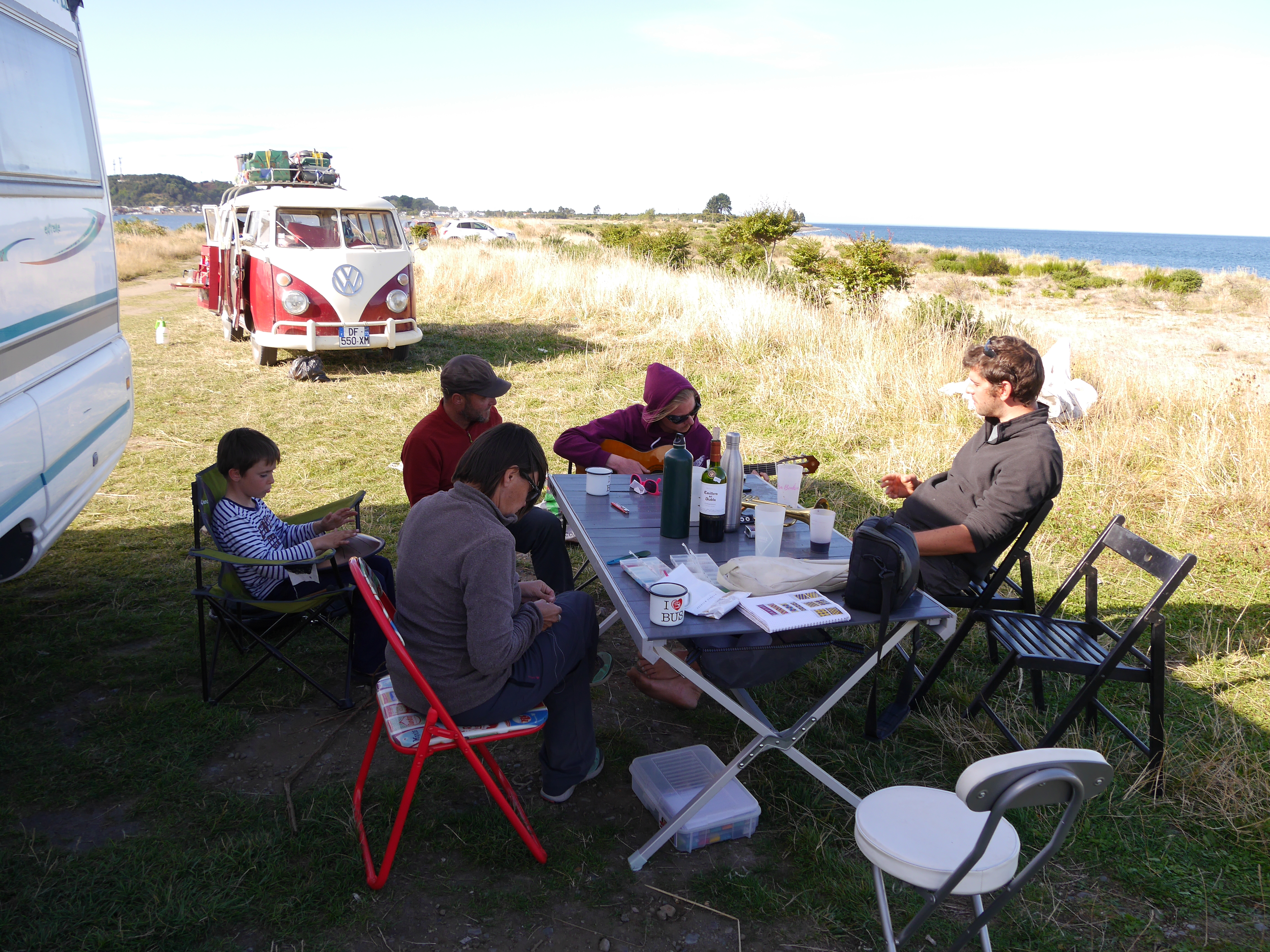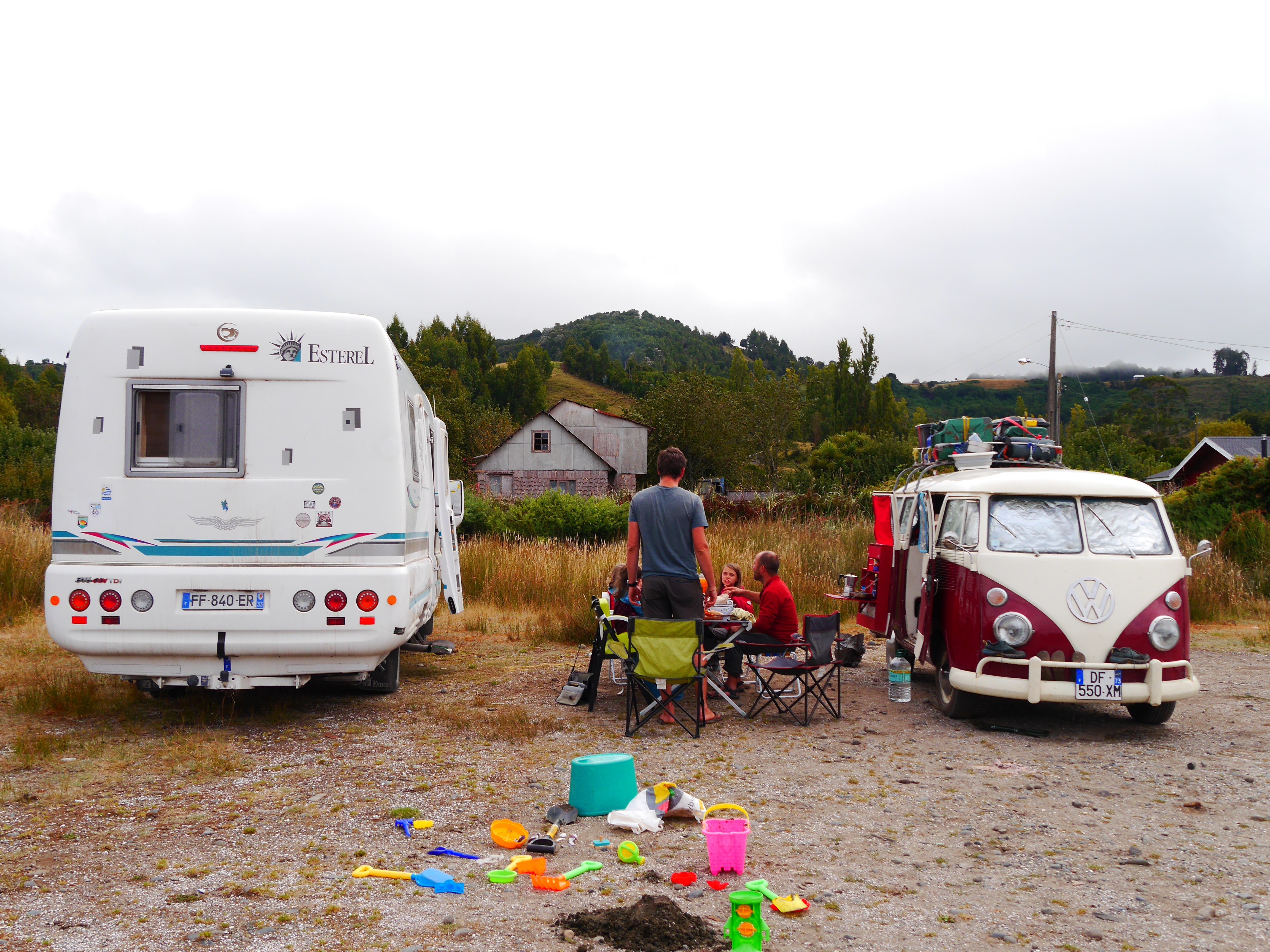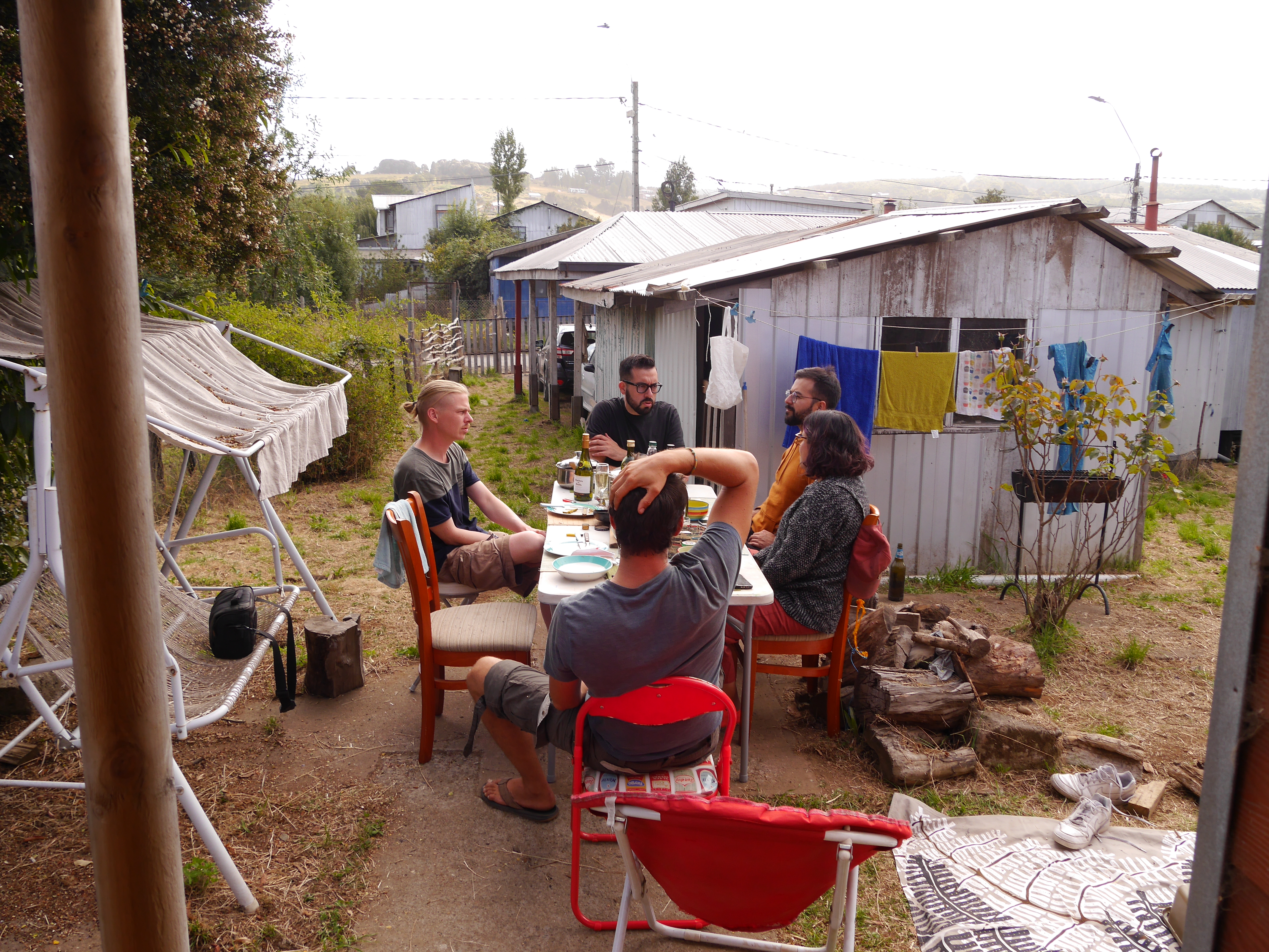 Ils nous emmènent ensuite chez eux, dans leur petite maison sur les hauteurs de Castro. On rencontre leur chienne Sinku, aussi gentille que folasse. Les filles se feront rapidement à ses grosses léchouilles en plein visage. Après avoir un peu joué dans le jardin, on fait manger les petites et on prend le temps de les coucher dans la chambre d’amis, en les rassurant assez longuement, comme il se doit à chaque découverte d’un nouvel endroit où dormir. On finit par y arriver, et on se pose enfin avec Paulina et Barbie, autour d’une bonne binche (sauf pour Pauli qui ne boit pas, son seul défaut). Comme je le disais plus haut, on ne connaissait pas très bien Barbie, et pas du tout Pauli. Et bonne nouvelle : l’un comme l’autre sont super chaleureux, accueillants, simples, marrants, intéressants. Ils nous ont vraiment regonflé de chaleur humaine, celle qu’on ressent en passant du temps avec de bons amis, et dont on manque de temps en temps en partant longtemps loin de chez soi ! Ils nous ont accordé une bonne partie de leur temps pendant une semaine, baladés à gauche à droite sur Chiloé, présentés à leurs potes tout aussi cool, et ils se sont adaptés sans aucun problème à notre logistique assez lourde de camping-caristes avec deux enfants en bas âges.