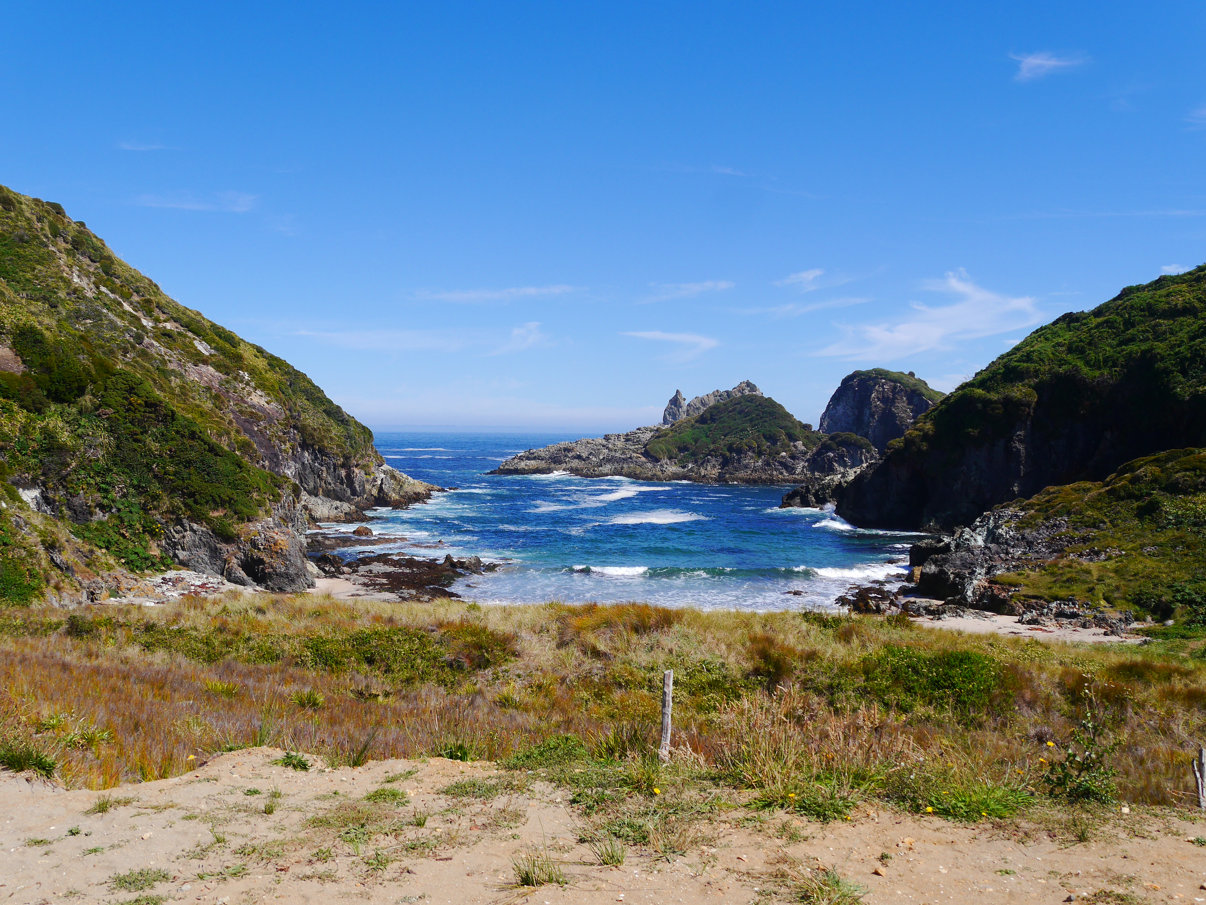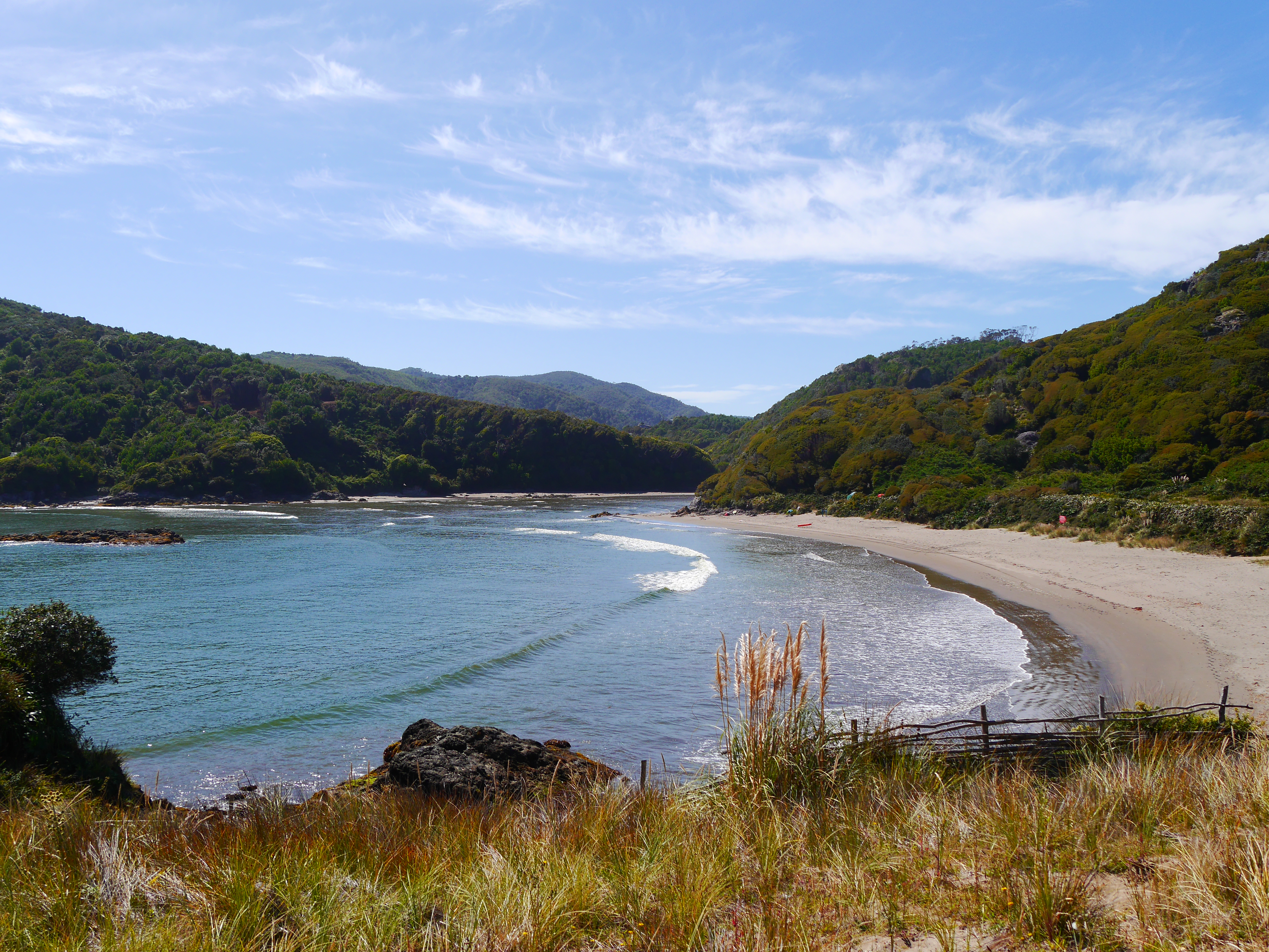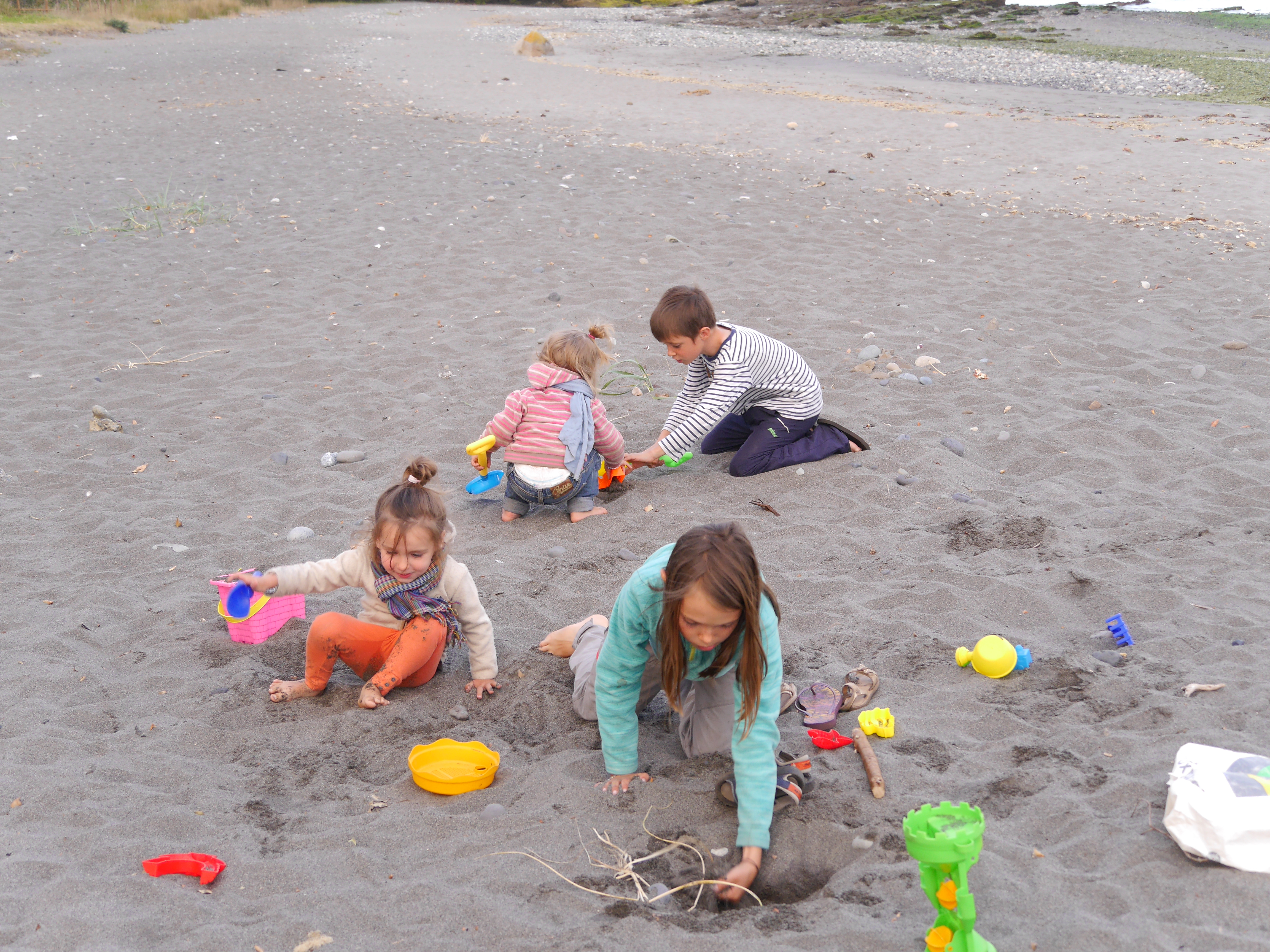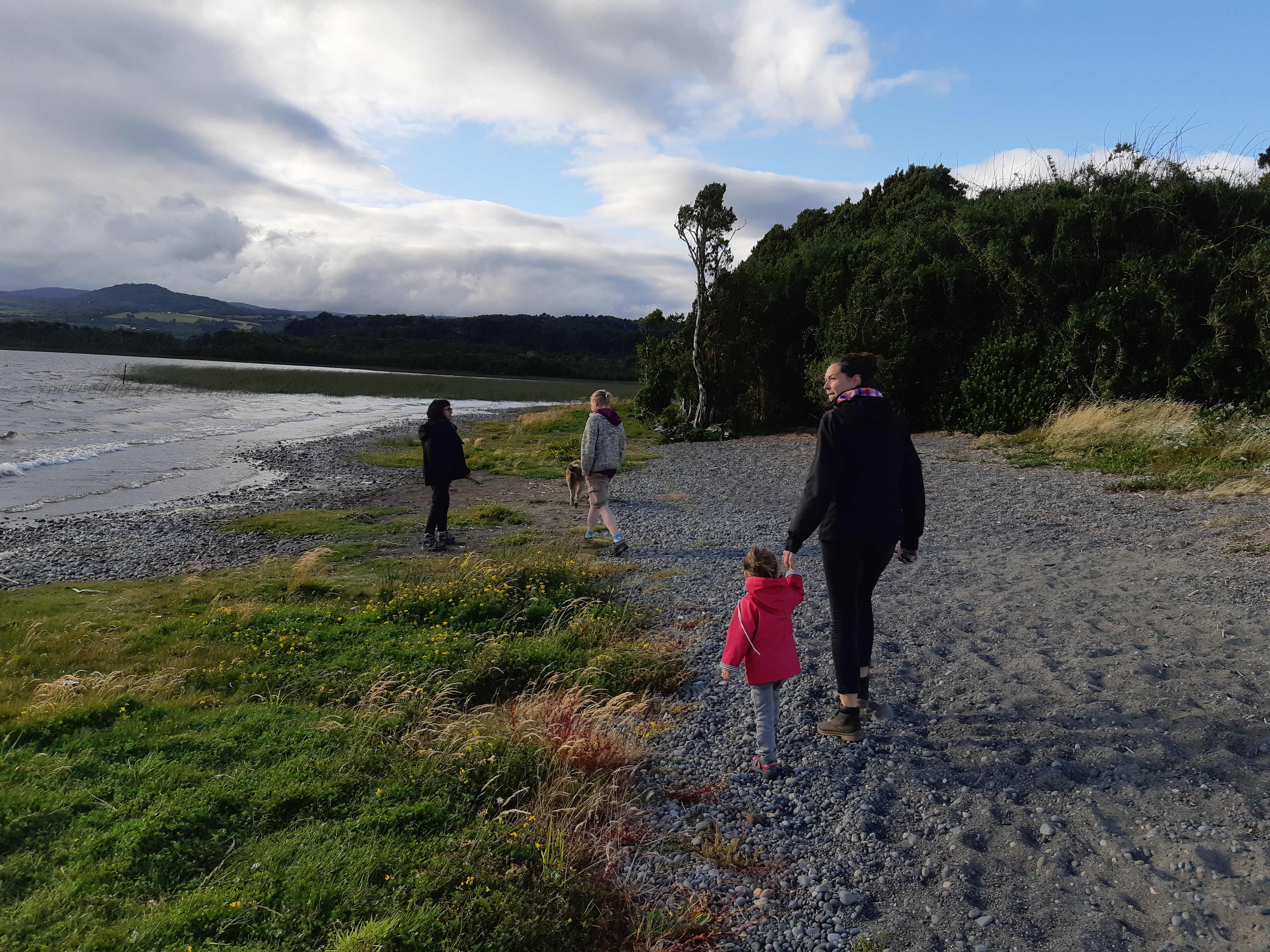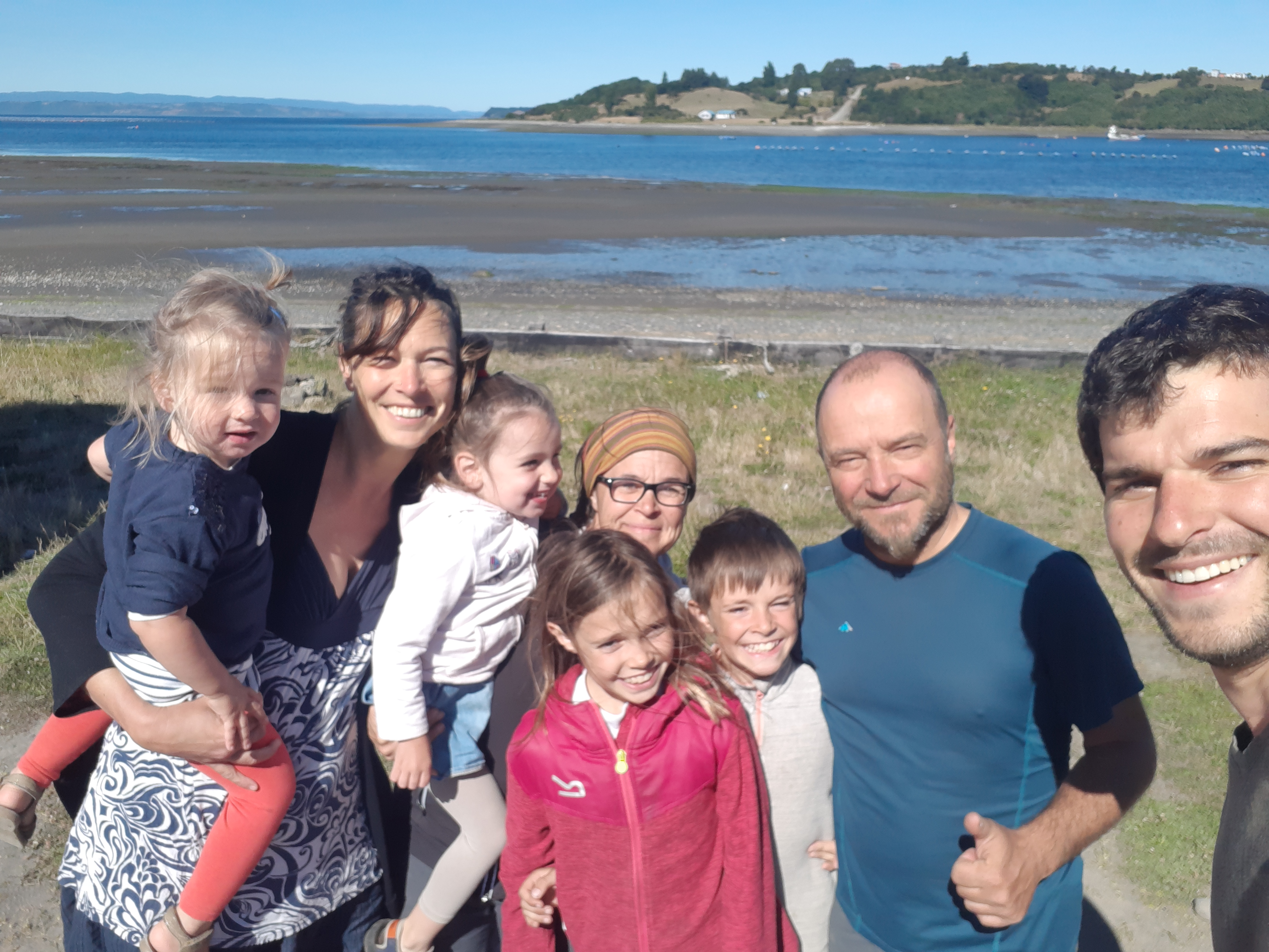 Le lendemain, on va faire un tour de l’autre côté pour voir l’océan Pacifique. On charge tout le monde dans Francisco, y compris Sinku qui s’occupe de faire rigoler les filles, et en route. On passe une petite heure sur la plage à regarder Sinku faire des aller-retours, les filles jouer, et à chercher des coquillages. On se trouve ensuite un petit coin dans la nature pour pique-niquer et glandouiller au soleil pendant la sieste des filles. Parce que nous avons la chance d’avoir un grand soleil pendant une bonne partie de notre semaine à Chiloé, ce qui est loin d’être donné à tout le monde ! On se fait une balade dans la végétation, Barbie nous donne un petit cours de botanique in vivo, une autre de ses compétences cachées.