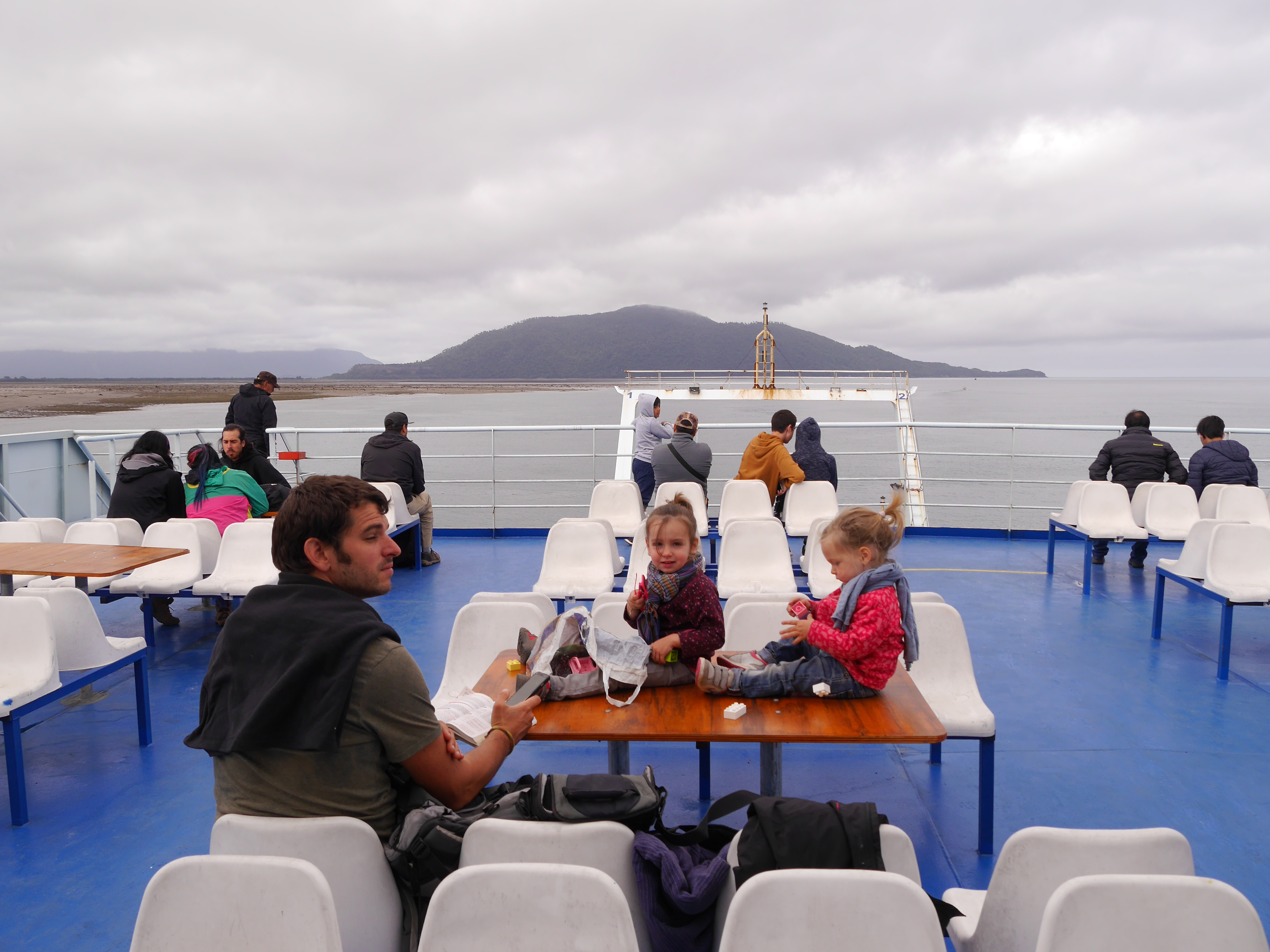 Après 6h de traversée très calme, avec un petit moment passé en compagnie des Lillibussiens sur le pont puis une grosse sieste dans Francisco, le ferry débarque à Castro, capitale de la province de l’île de Chiloé. Comme promis, notre pote Barbie nous attend sur le port, accompagné de son épouse Paulina.