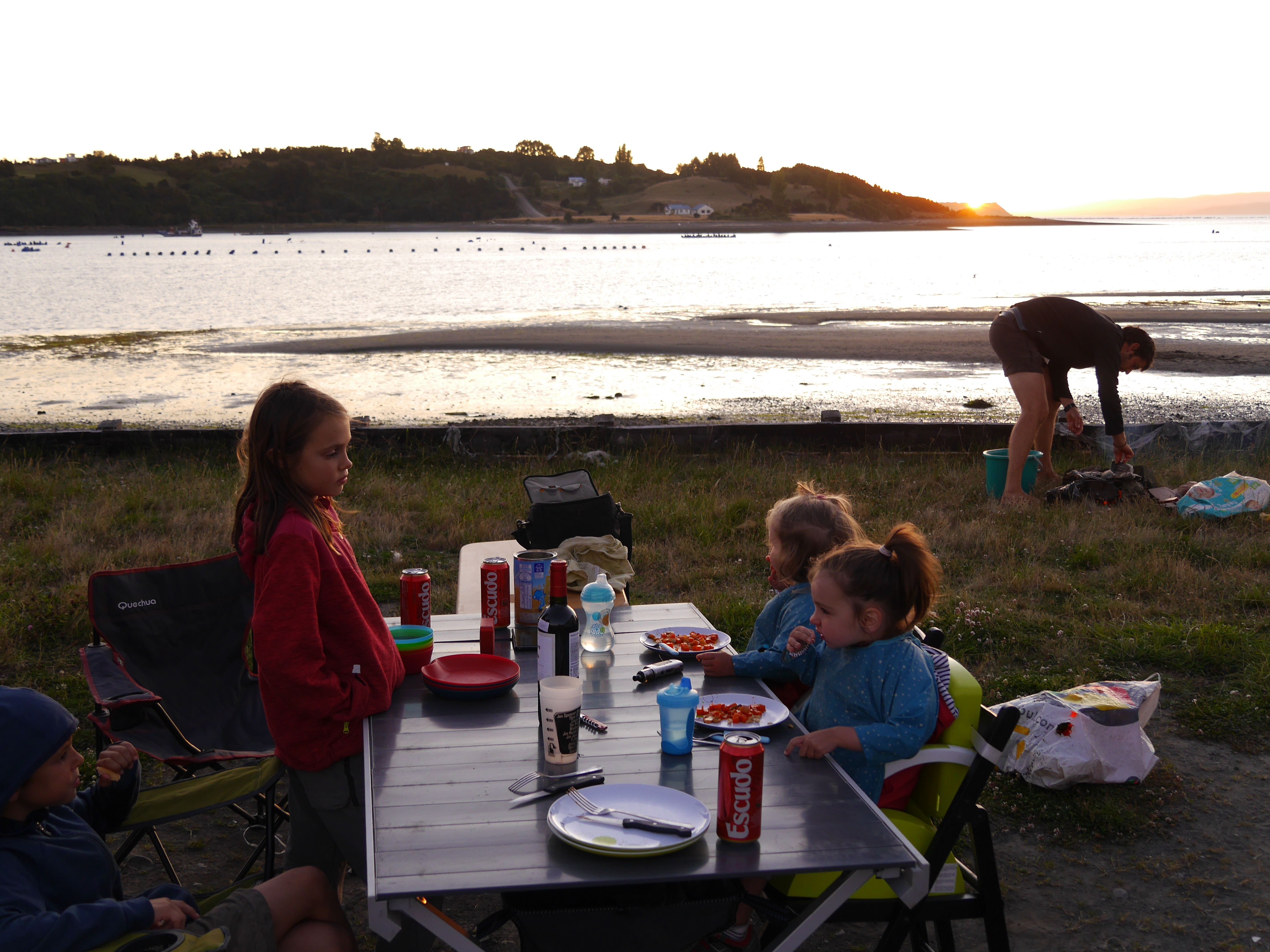 La journée du lendemain, on se retrouve à peu près tous sur un spot que seuls les chilotes connaissent, dans une sorte de grande clairière, au bord d’une rivière qui forme un bassin avec un banc de sable qui stoppe le courant. Un petit paradis naturel où on pique-nique et on se baigne (enfin pas Nanie, l’eau étant à moins de 27°, soit glaciale…). On réussit même, grâce aux efforts de Nanie, à endormir les filles dans leur mini tente 2sec pour la sieste.
