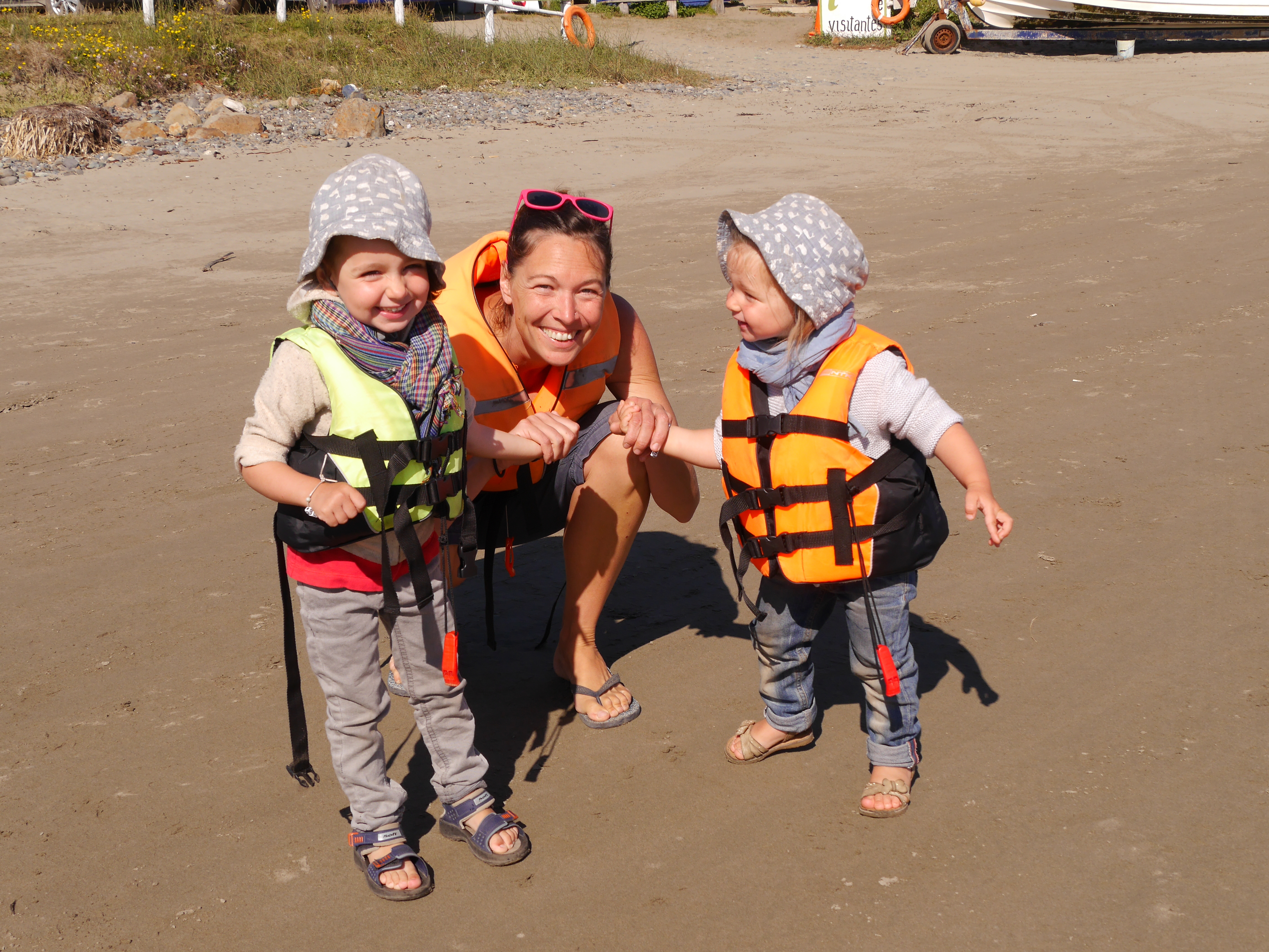 Arrive alors le dernier jour de cette formidable semaine avec Pauli et Barbie. On squatte une dernière fois leur douche et on lève le camp, un peu nostalgiques. Après quelques dizaines de km de route dont un ripio particulièrement moche, on arrive au Nord Est de Chiloé, à Duhatao, dans une sorte de petite baie bordée de plages de sable clair, dont nous avait parlé German. L’endroit est presque désert et on y passe deux belles journées de pure farniente et baignade surtout pour les petites. On passe ensuite une matinée à Pinihuil où on décide de faire une petite excursion touristique en bateau. On nous fait serpenter entre de petits îlots rocheux couverts de pingouins, de loups de mer, et d’un grand nombre d’espèces d’oiseaux marins qui nous sont présentés par un guide intéressant et plutôt marrant.