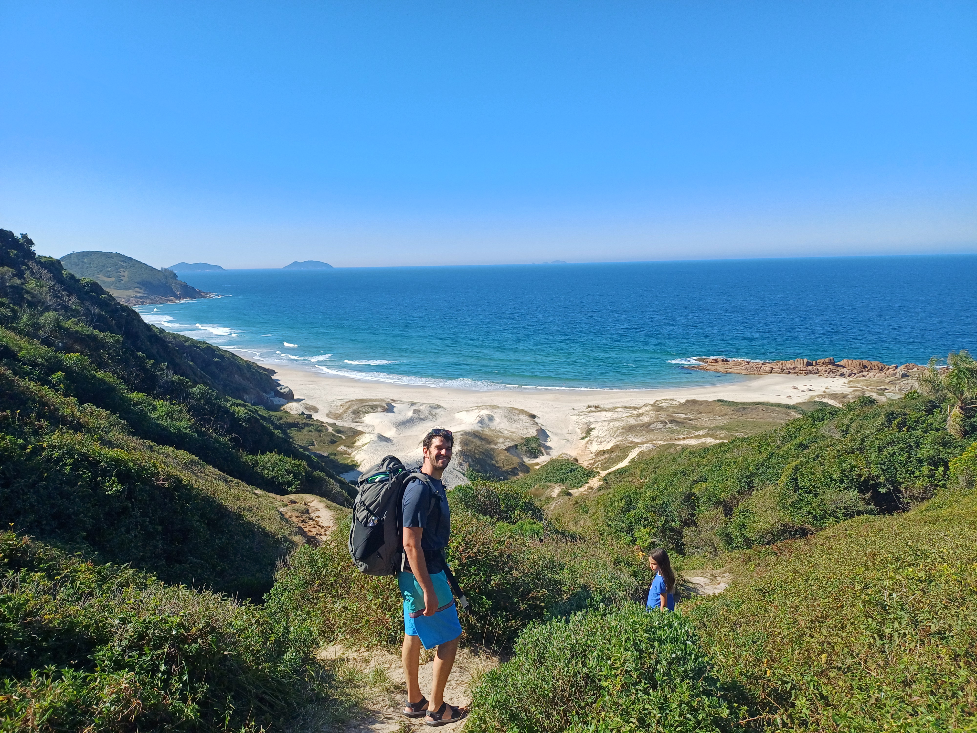 On passe ensuite dans l’état de Santa Catarina, où on finit par arriver à Guarda do Embau. Et là, c’est le bonheur : ça y est, il fait bon, la plage est carte-postalesque : sable blanc, sur une lagune tranquille avec l’océan à 10mn de rame, palmiers, bar de plage avec caïpirinha et poisson frais, l’ensemble cerné par des montagnes couvertes par la Mata Atlantica, la dense forêt bordant l’océan. Le bled en lui-même est très mignon, une petite station balnéaire paumée. On est garés juste à côté de la plage, dans un parking payant tenu par un petit papi qui passe ses journées allongé dans une cabane à faire la sieste. On passe nos journées à la plage, l’eau est bonne, la musique et les caïpi aussi. Un sentier longeant le littoral et passant dans la forêt nous mène à une plage complètement isolée, comme il y en a des dizaines dans le secteur. L’ambiance vacances sous les tropiques pointe le bout de son nez et on s’en réjouit, c’est ce dont on rêve pour le début de notre voyage, histoire de bien décrocher !