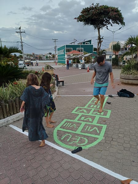 Le centre-ville dégage une ambiance de petite station balnéaire tranquille et décontractée avec des restos de poisson, des bars qui débitent de la samba jours et nuits, des glaciers, etc… on profite de tout ça pendant plusieurs jours en général sous un soleil agréablement atténué par le vent côtier. On invente la marelle avec une tong, la « tonguelle », sur une marelle peinte sur la place centrale où on goûte au passage les délicieuses spécialités bahianaises d’un food truck. On n’ira finalement pas jusqu’à Bahia par manque de temps, mais entre ça et tout ce que l’on a entendu et lu sur cet état qui semble superbe à tous points de vue, je me dis qu’il faudra revenir au Brésil un jour… On dort dans un petit parking privé (un terrain vague) dont les patrons tiennent un stand de rue avec de délicieux cocktails et jus de fruits frais. Juste à côté, une très jolie petite église du XVIIe siècle, blanche et bleue, est perchée comme un phare sur une colline face à la mer, et qui surplombe la ville. La vue est magnifique.