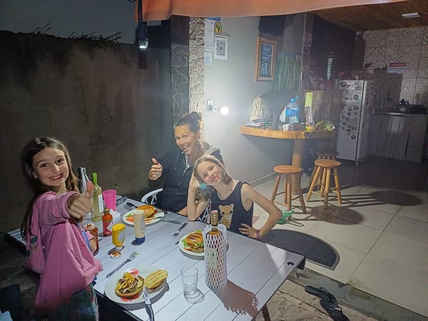 Après une nuit pas géniale dans la rue, on décide d’aller dormir dans un espace privé aménagé pour les voyageurs en camping-car, quitte à allonger quelques billets. C’est une tendance qu’on privilégie de plus en plus car c’est beaucoup plus de confort pour assez peu de frais supplémentaires : dans un camping où on peut sortir table et chaises et se poser dehors (pas encore fait dans la rue mais ça finira bien par arriver!), et on se fait plus facilement à manger. Ça nous évite de faire les gros et d’aller au resto , cette dernière option étant souvent instinctivement privilégiée chez tout Ptitdid qui se respecte. On se retrouve donc seuls dans cet espace clos avec cuisine, table, churrasco, wc douches et jardin. Comme si on avait une maison à nous pendant 24h, qu’on décide vite de transformer en 48h. C’est le bonheur : on joue au ballon avec Lolotte, on s’entraine à lancer et dribler car elle veut se mettre au hand au retour. On se dit que vu son énergie, sa carrure et son côté un peu brute, elle devrait accrocher sans problème ! Pendant ce temps Oli et Nanie font des perles tranquillou. Ensuite on se fait un bon barbeuk et apéro, on joue aux dés, on finit même par danser, on rigole bien. Une fois les filles au lit on papote longuement avec Nanie et on finit par sortir la guitare pour les prémices d’un talentueux duo dont le répertoire s’étoffe peu à peu. Bref un super moment à 4 puis à 2 qui nous remet les curseurs au vert, et nous donne envie de continuer à profiter des plaisirs simples, tranquillement.