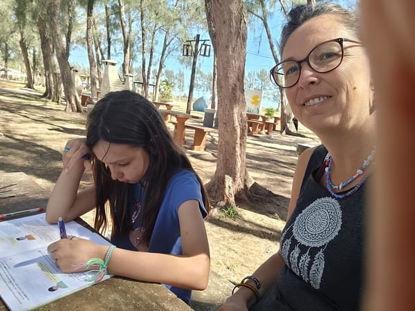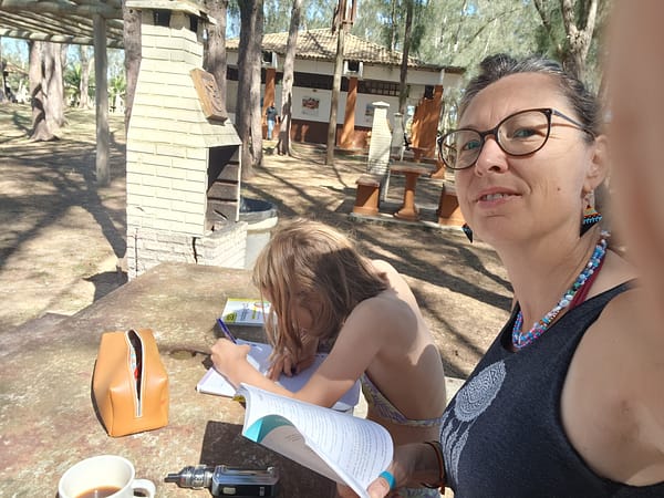 Nanie continue à jouer magistralement son rôle de maîtresse d’école, même quand les filles sont ronchonnes à souhait, et ce n’est pas toujours une mince affaire. On nous a d’ailleurs prévenu à plusieurs reprises que ce n’est pas évident et que nombreuses sont les familles qui finissent par lâcher l’affaire. Nanie arrive toujours très calmement à ses fins : elle s’adapte, explique, reprend, encourage, temporise… à tel point que je me demande si elle ne médite pas en cachette elle aussi. Mais non, juste son litre de café et sa vapote. A ce rythme et d’après ses prévisions, le programme sera bouclé avant notre retour !