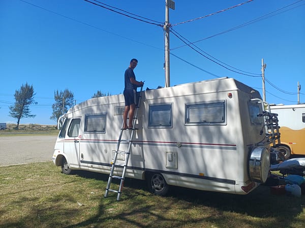 Je profite pour bricoler un peu Francine qui ne nous épargne pas les inévitables problèmes techniques que nous savons maintenant inhérents à un grand voyage en camping-car : notre frigo bug toujours en mode gaz malgré plusieurs bidouilles, l’une de nos fenêtres de toit s’est arraché avec le vent (réparation 2 semaines après, en attendant j’ai fait une belle cloison en sac poubelle et scotch de compet’), bras de fenêtre latérale arraché par le vent, étagère effondrée à force de vibrations, portes de placards qui s’ouvrent en roulant… La revente et le retour à une maison en dur et spacieuse sera une vraie consolation à la fin du voyage !