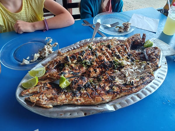 Après une dernière petite session perles/film pour la team Oli-maman et surf/ptit dej en ville pour la team papa-Lolotte , on lève le camp pour Arraial do Cabo. C’est une presqu’île battue par les vents (qui ne nous ont pas épargnés, cf supra), dotée des plus belles plages que l’ont ait vues au Brésil, et ce n’est pas peu dire. Sable fin et blanc, eaux limpides, nature préservée autour, et snorkeling avec grandes tortues de mer qu’on voit parfois à 2 mètres de nous ! Le camping est royal pour un prix dérisoire : toutes commodités, douche XXL qu’on squatte 30mn par jour après la baignade (on avait du crédit douche à utiliser, croyez-moi…), à 300m d’une plage isolée ou je me balade tous les matins, seul dans un cadre incroyable, avant d’aller rejoindre mes 3 chéries au réveil pour le petit déjeuner, puis plage avec les filles… Les ingrédients du bonheur sont là. On se fait un ou 2 restos en ville : on prend moqueca , un délicieux ragoût bahianais de poisson au lait de coco et citron vert avec plein d’aromates, et du poisson fraichement pêché grillé.
