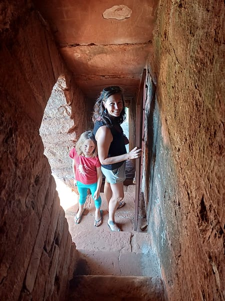 Bon, on n’a pas fait que de la farniente quand même. On a trouvé un super garagiste (encore), qui a enfin réussi à réparer notre frigo, traité la corrosion pour de bon (3 jours de traitements), et plein d’autres petits trucs au passage. Et on a visité les ruines jésuites du coin : celles de Trinidad et de Jesus, classées au patrimoine mondial de l’Unesco. On a un peu de mal à intéresser les filles à l’histoire de ces vieilles pierres, surtout qu’on doit traduire au fil de l’eau les explications des guides quand on en croise. Olivia préfère observer les oiseaux par exemple. Jusqu’à ce qu’elle se fasse sermonner de très très près par un couple d’oiseaux dont elle se rapprochait un peu trop des petits. Mais avec Étienne on accroche bien, on se renseigne sur cet épisode des missions.