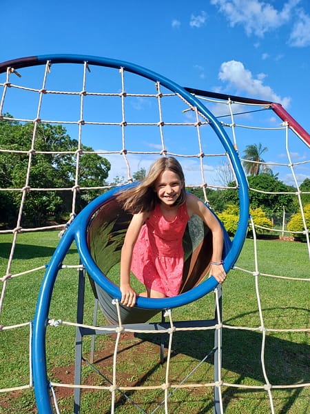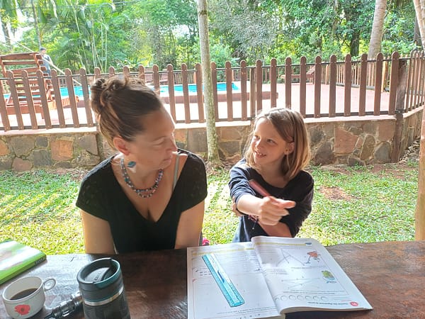 Nous décidons d’aller voir le côté argentin des chutes d’Iguazú, le côté le plus impressionnant car c’est là qu’on est au plus près des cascades. Le côté brésilien offre plutôt une vue d’ensemble des chutes. Nous passons donc la frontière à Foz do Iguaçu pour passer à Puerto Iguazú. On se pose dans un petit camping tout mignon avec une petite piscine où les filles ont le temps de barboter un peu à la tombée de la nuit.