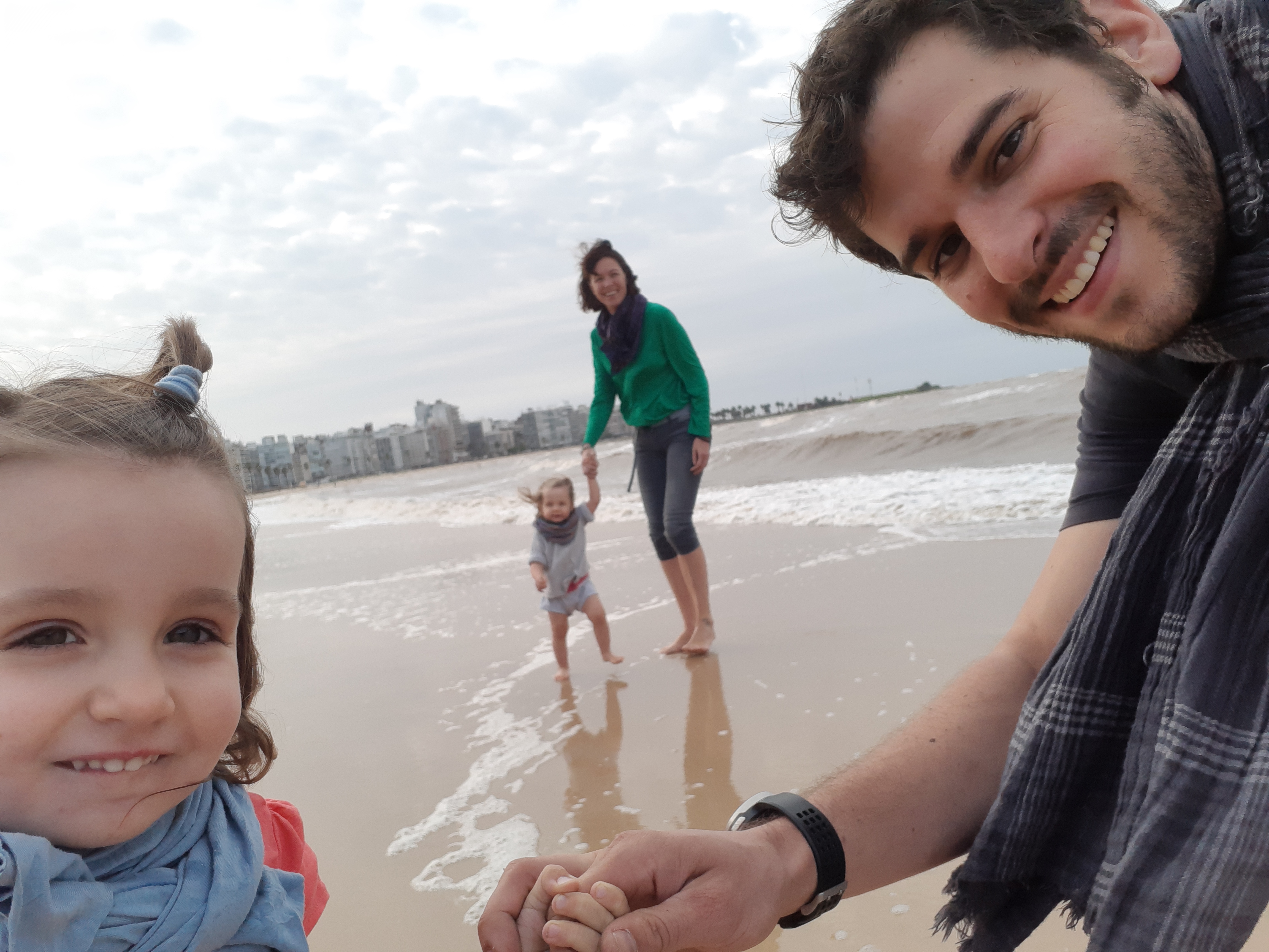 Et puis à l’heure ou je boucle mon premier mot dans ce blog, nous sommes à 30mn de Montevideo, dans un lieu magnifique en pleine nature, entourés d’arbres, près d’une plage sauvage, ou les uruguayens viennent en famille faire leur asado (barbecue) dominical sur fond de cumbia ou de rock (ils sont très rock !). On a sorti la table et les chaises, le hamac, on est enfin posés hors de notre camping-car, et c’est déjà un tel bonheur ! Les filles ont joué dans l’eau et le sable, on a pris l’apéro dehors, Nanie a fait sa sieste dans le hamac, j’ai été courir un peu, et là je tapote sur mon clavier en attendant que tout le monde se réveille, sur fond de vagues et de vent dans les feuilles… On y est ! On ne prévoyait pas de passer beaucoup de temps dans les grandes villes, eh bien maintenant c’est une certitude !