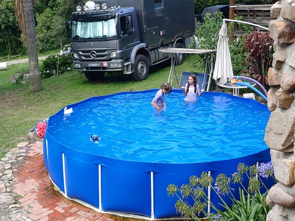 On s’est fait aussi une session à la deuxième plus grande piscine d’Amérique du Sud. Qu’on a failli ne voir que depuis le portail d’ailleurs, car lorsque nous arrivons tout est vide, on ne voit personne. Devant l’énorme déception des filles Étienne tente le tout pour le tout et on va pleurer avec les filles bien en évidence à l’accueil. On nous explique que c’est fermé au public et qu’ils n’ouvrent qu’aux personnes venant dormir avec un camping car. (Pas de bol on n’en a plus ^^). Mais Étienne ne se démonte pas et dit qu’on aura sûrement le nôtre ce soir, qu’on peut payer le prix (dérisoire) de stationnement en avance et qu’on reviendra peut-être avec le soir-même. Après discussion avec le patron c’est accordé ! À nous la piscine de 270 mètres sur 97, qui peut convenir 1340 personnes, et dans laquelle nous serons… 4.
