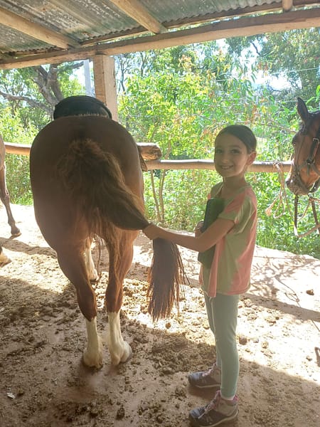 Le 16 novembre nous partons faire une balade à cheval avec Johnny. Il est adorable, et ses chevaux aussi. Les filles peuvent les brosser, elles adorent. Les chevaux sont dynamiques et à l’écoute, nous sommes plus autonomes que lors de la première balade au Brésil. On s’essaie même au trot et au galop !
