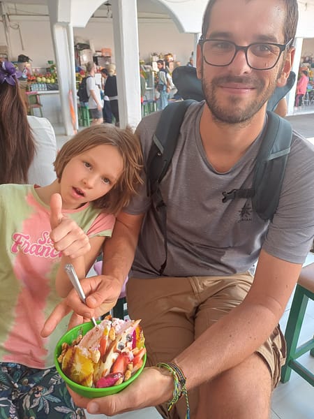 Ensuite c’est direction les étals de fruits. C’est le printemps ici, et tous les fruits sont délicieux. Étienne se gave de mangues tous les jours, les filles c’est plutôt cerises, prunes, pêches, pastèques… Pour un prix dérisoire on se fait préparer des salades de fruits énormes, avec chantilly et toping. Charlotte est au paradis.