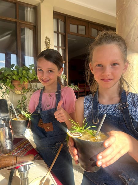 Nous avons pris un cours de cuisine bolivienne et cocktails sur les hauteurs de Sucre, chez Ancestral. La dame qui nous accueille (dont nous n’avons pas retenu le nom…) est d’une patience infinie avec les filles, et nous apprend énormément de choses sur sa famille qui cultive les produits que nous cuisinons. Nous passons 3h à alterner fabrication de cocktails, préparation de trois plats typiques de la région, et dégustations.