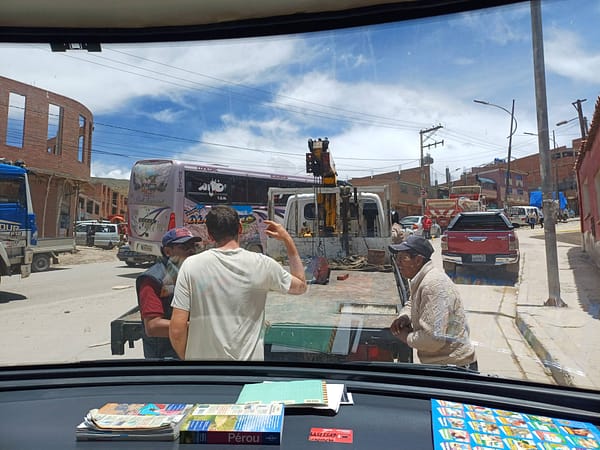 On reprend la route, prochaine étape qui nous fait peur : la ville de Potosi. Située à 4200 mètres d’altitude, c’est le gros cap que nous avons à passer. Après ça, ça descend jusqu’en Argentine. Mais bien sûr, si nous manquons d’oxygène à cette altitude, Francine aussi. Ça ne loupe pas, à 5km à peine du plus haut de la montée de Potosi, Francine n’arrive plus à avancer. On se retrouve à l’arrêt, au milieu d’une circulation dense, brouillonne, avec des bus stressés partout, c’est un peu la panique. Le pire moment du voyage jusqu’à présent. Etienne essaie de trouver quelqu’un pour nous tracter pendant deux heures. Mais même si nous avons les câbles adéquats, qu’ils ont tous la boule nécessaire sur leur voiture, et que nous proposons de payer, personne ne veut nous aider à gravir ces 5km restants.